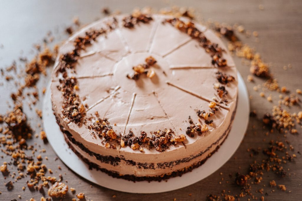 Składniki: Śmietanka, jaja, mascarpone, substancja słodząca: erytrol, napój migdałowy, mleczko kokosowe, orzechy laskowe, kakao, pasta z orzechów laskowych, mąka migdałowa, mąka kokosowa, babka jajowata, czarne kakao, gorzka czekolada (miazga kakaowa, proszek kakaowy o obniżonej zawartości tłuszczu, emulgator: lecytyna sojowa, naturalny aromat waniliowy), olej kokosowy, woda, karob, woda, sól himalajska, proszek do pieczenia, guma ksantanowa.